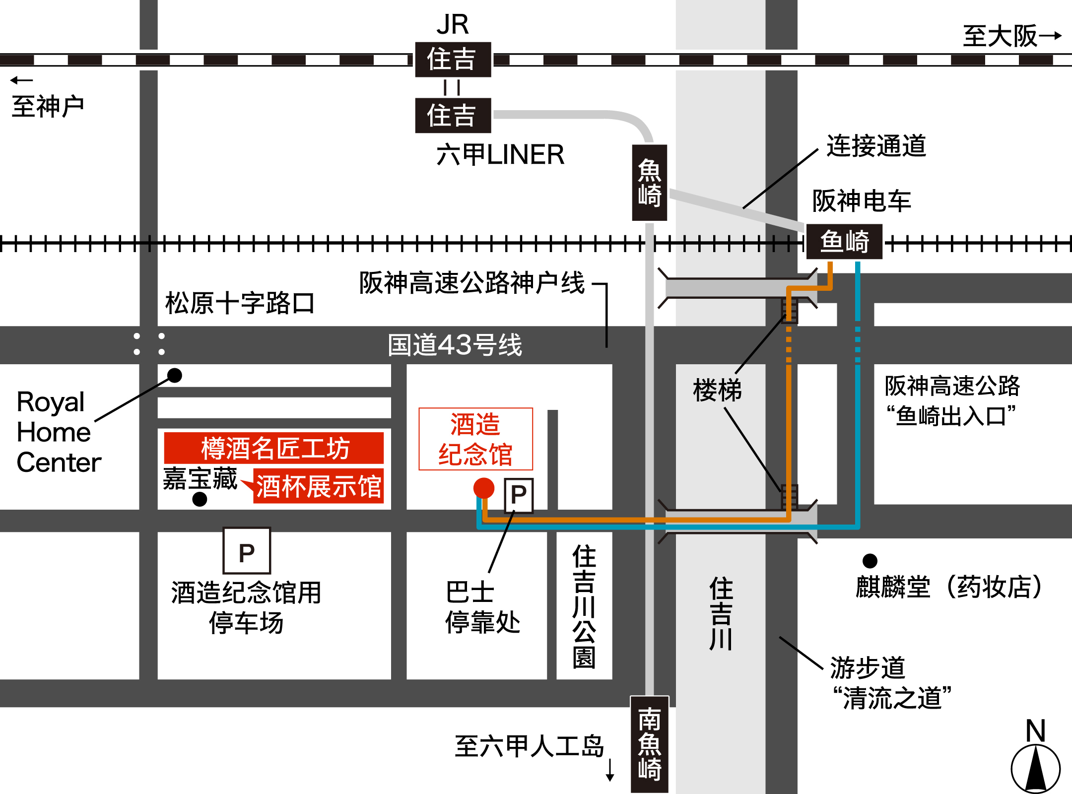 在“住吉站”换乘六甲LINER,在“南鱼崎站(第2站,约4分钟)”下车。电梯1楼出去后往西北步行约2分钟。