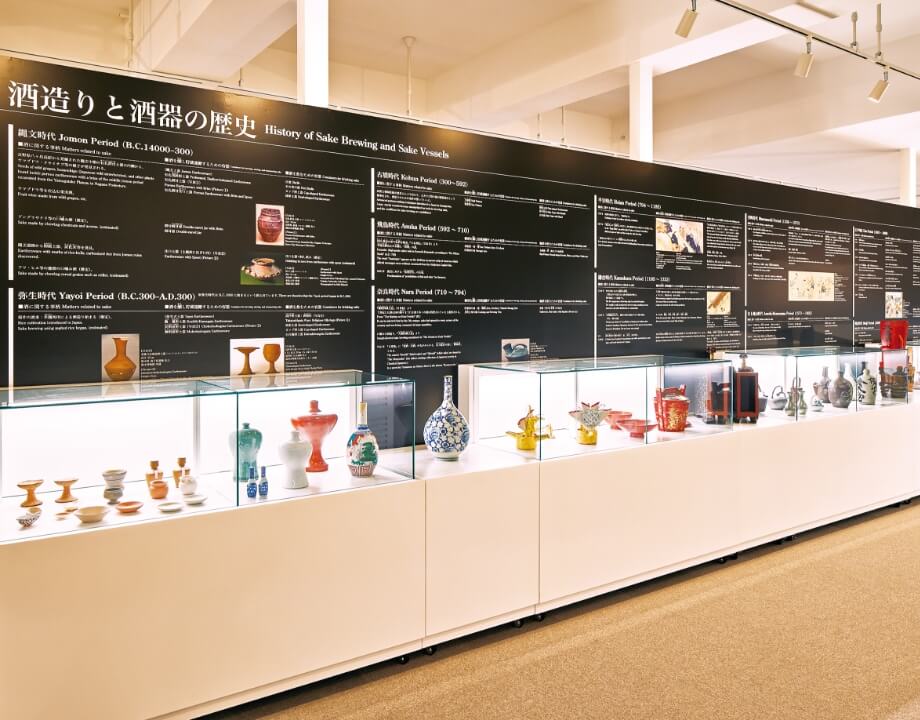 从最初開始酿酒到近代为止,按照时间顺序将相关历史汇整为“酒类相关事项”、“酒的容器”两大年表。除了酒杯以外,也展示其他相关酒器。