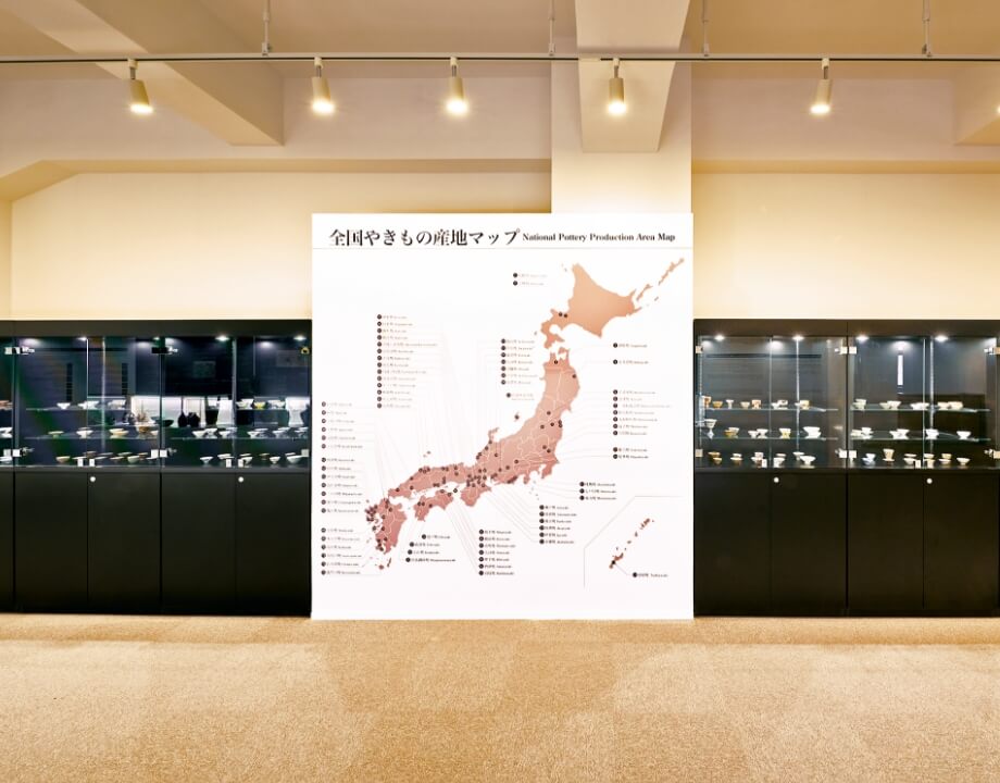 在地图上标示出日本全国陶瓷器产地,并按照地区排列各地陶瓷杯。请观赏产地不同且充满情趣的酒杯。